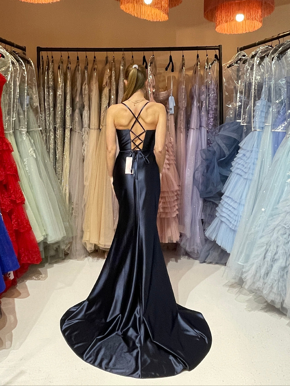Mache beim Abiball und Examensball eine strahlende Figur in diesem atemberaubenden Abendkleid Bente. Das enganliegende Corsagenkleid in elegantem Marineblau kombiniert Eleganz mit modernem Flair: Der hohe Beinschlitz ermöglicht mühelose Bewegung, während die fließende Schleppe einen Hauch von Glamour verleiht. Die tiefe Rückenschnürung und überkreuzten Träger mit Neckholderoptik schaffen einen verführerischen Rückenausschnitt. Der glänzende Satinstoff aus 100% Polyester schmeichelt deiner Figur und fällt wunderbar. Ein zeitloses Meisterwerk für deinen besonderen Abend.