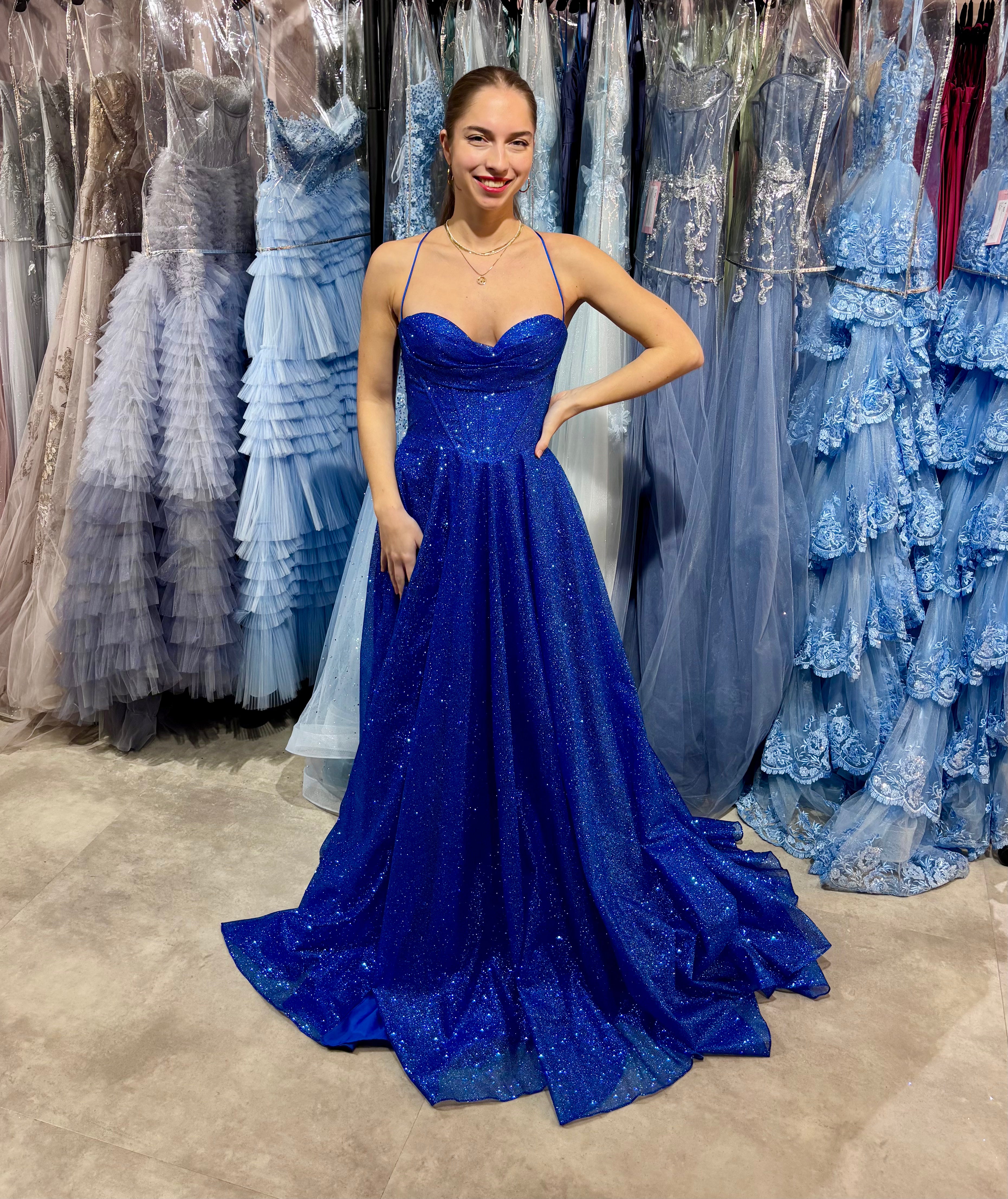 Dein großer Moment verdient ein Kleid, das genauso glamourös ist wie du! Dieses königsblaue Abendkleid besticht mit einer eleganten A-Linie und funkelt dank durchgehender Glitzerapplikation im Licht. Die raffinierten Spaghettiträger verbinden sich mit der Rückenschnürung – ein Statement-Detail, das deinen Rücken perfekt in Szene setzt. Drapierungen im Brustbereich schmeicheln deiner Figur, während der seitliche Beinschlitz Bewegungsfreiheit garantiert. Praktische Taschen und ein weiches Futter runden das Paket ab. Von oben bis unten bodenlang – pure Abiball-Magie in funkelndem Tüll!