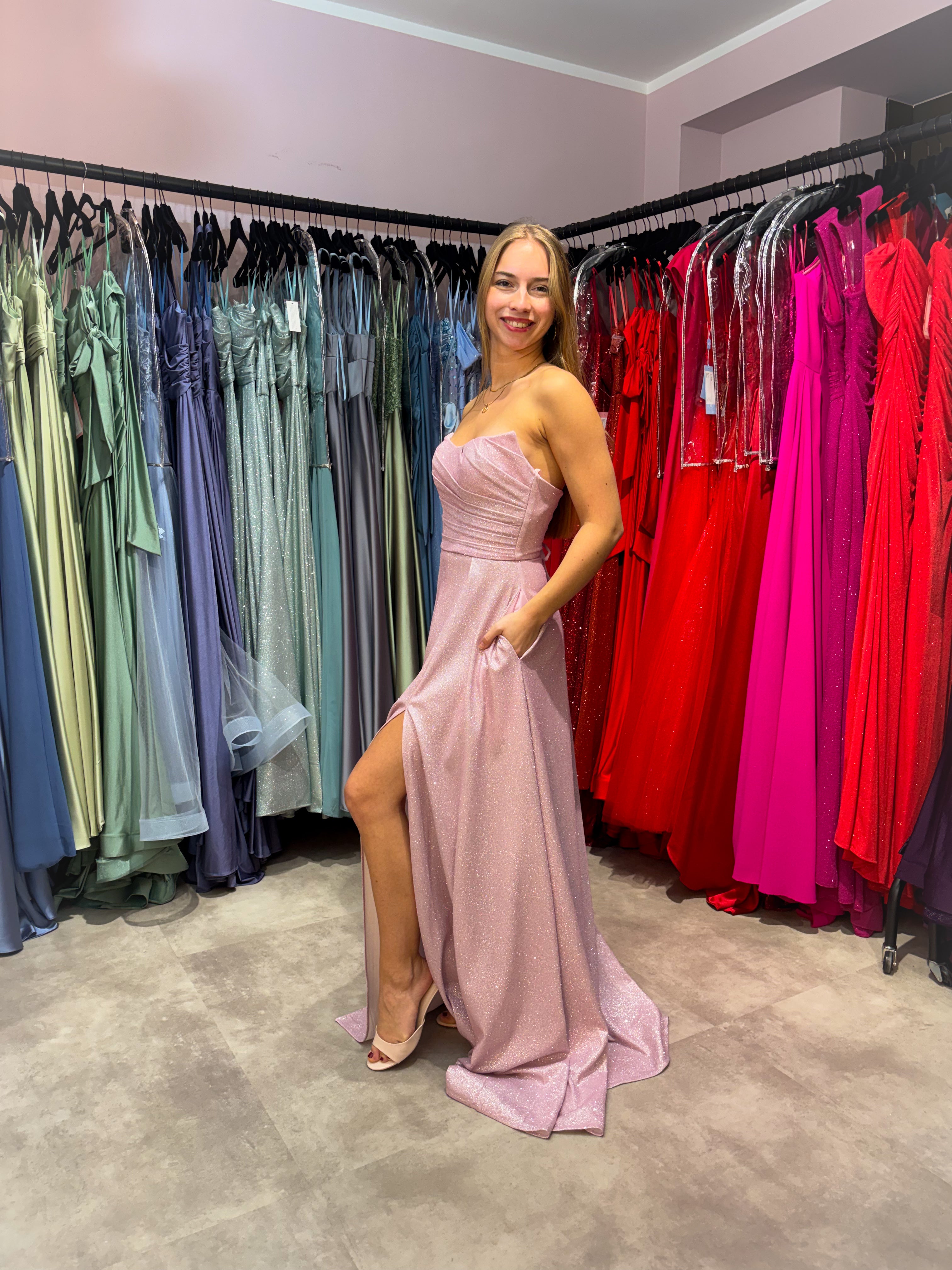 Dieses atemberaubende Abiballkleid in zartem Pastellpink ist dein perfekter Begleiter für unvergessliche Abende. Das elegante A-Linien-Design mit trägerlosem Schnitt schmeichelt jeder Figur, während die aufwendige Drapierung im Oberteilbereich für Raffinesse sorgt. Der komplette Glitzerbesatz lässt dich im Licht funkeln und strahlen – ideal für Abiball, Abtanzball oder als Hochzeitsgast. Die praktischen Seitentaschen bieten Komfort, der edle Beinschlitz verleiht Bewegungsfreiheit, und die Rückenschnürung ermöglicht eine perfekte Passform. Das leichte Polyestermaterial fällt wunderbar und ermöglicht ganznächtige Eleganz ohne Kompromisse. Mit integrierten BH Cups sitzt das Kleid perfekt.