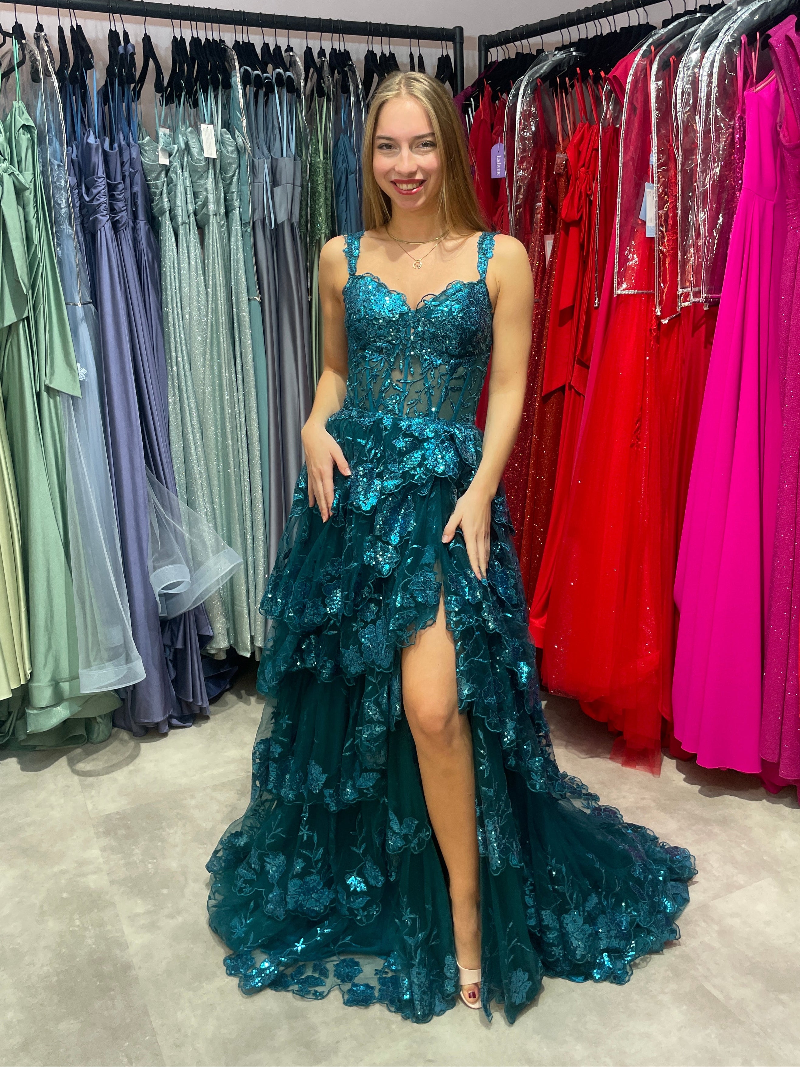 Elegantes Abendkleid Tanny in strahlendem Petrolgrün für unvergessliche Momente. Das bodenlange Kleid besticht durch seine raffinierte A-Linie und integrierte BH-Cups für perfekten Halt. Breite Spitzentäger und ein transparentes Oberteil, verziert mit funkelnden Pailletten, schaffen einen glamourösen Look. Gestaffelte Volants und der hohe Beinschlitz verleihen Bewegungsfreiheit und Eleganz zugleich. Der Rock ist ebenfalls mit feiner Spitze und Pailletten besetzt. Das hochwertige Material aus 100% Polyester mit Tüllstruktur bietet Stabilität und Formbeständigkeit für den ganzen Abend.