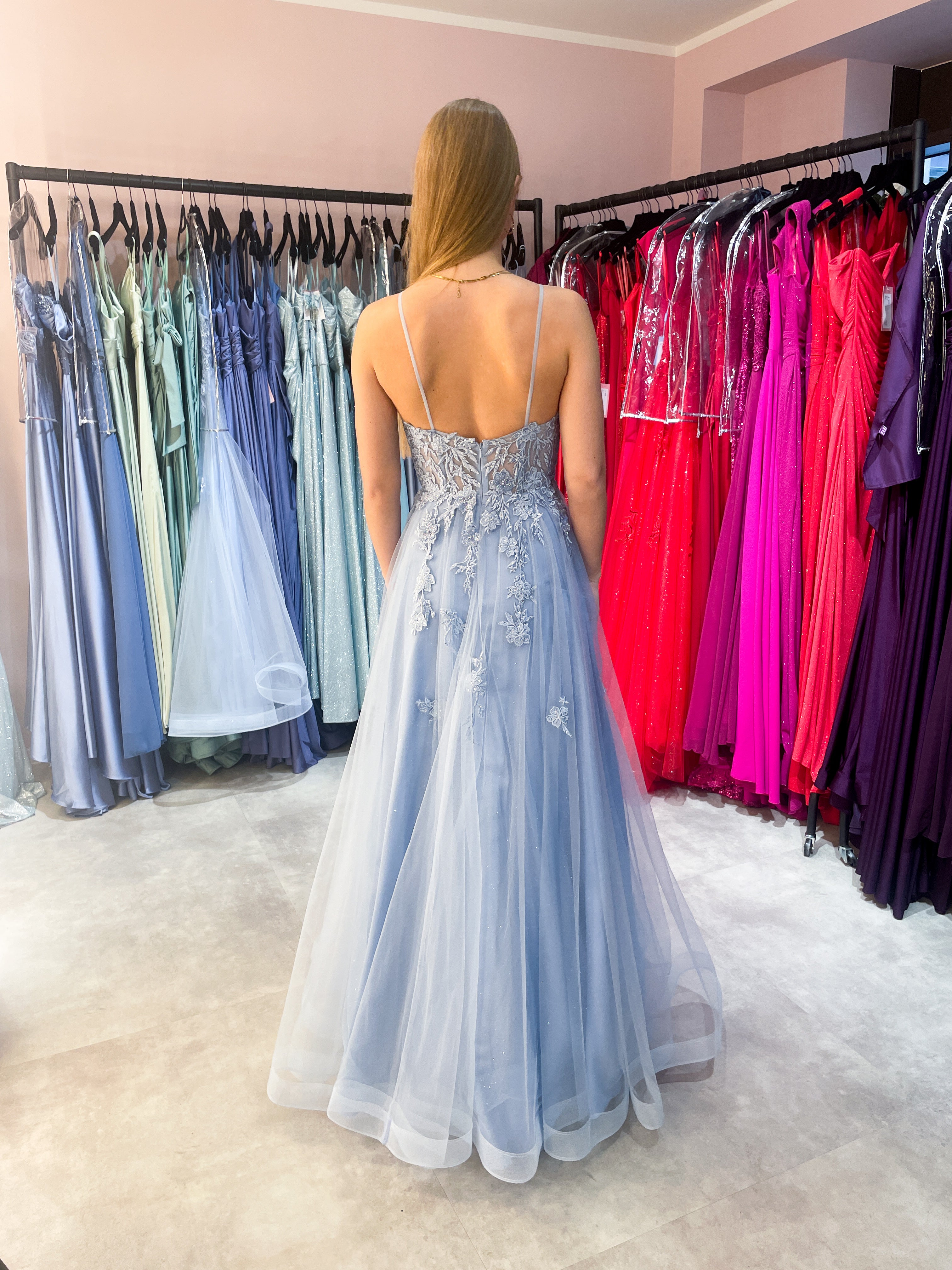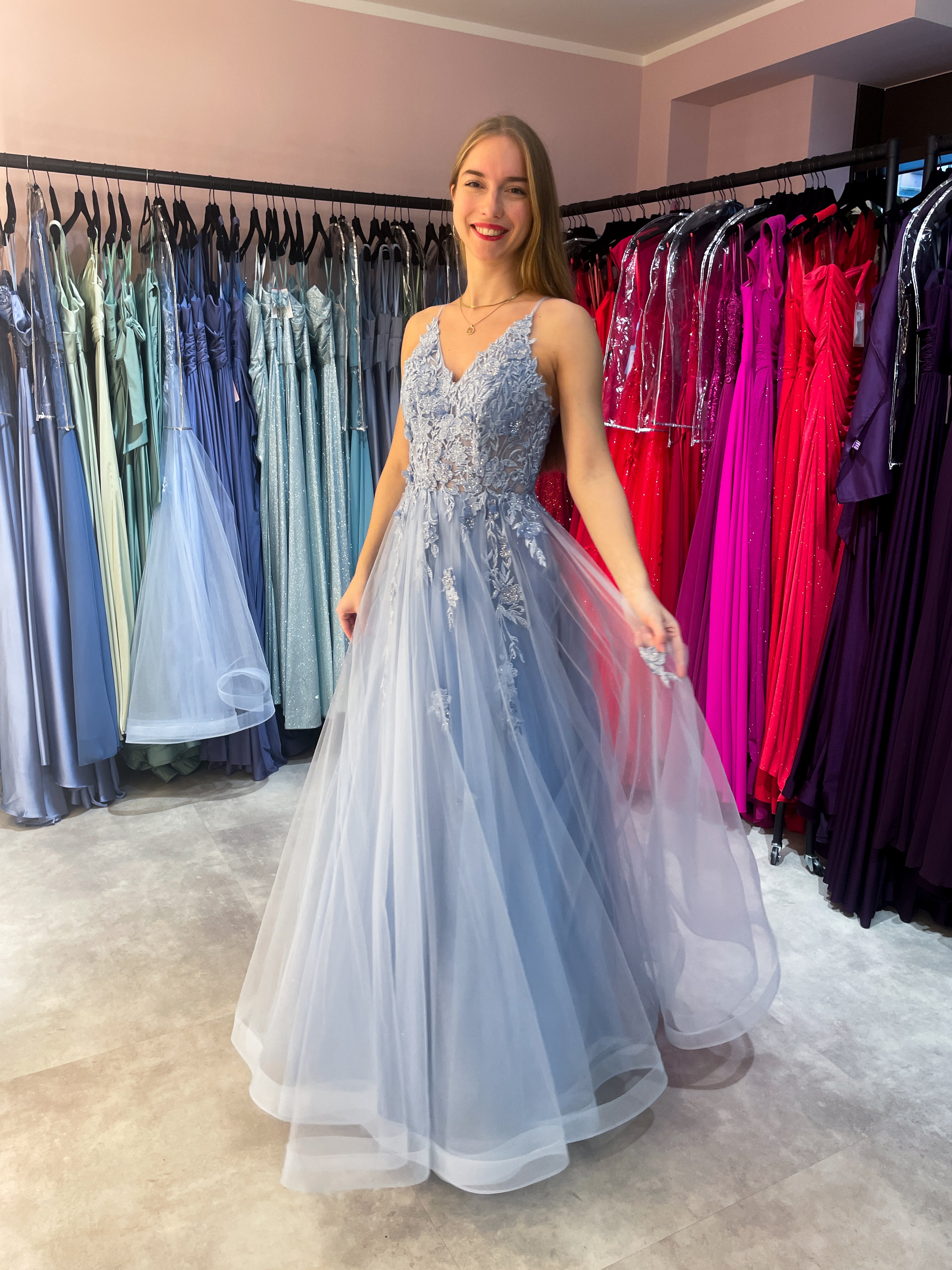 Traum in Hellblau! Dieses bezaubernde Tüllkleid ist deine perfekte Begleiterin für den großen Auftritt beim Abiball. Mit verspielten Spaghettiträgern und romantischer Spitzenverzierung am Oberteil setzt du sofort Akzente. Der mehrlagige Softtüll des Rocks tanzt bei jeder Bewegung mit dir – pure Leichtigkeit und Eleganz! Der tiefe Rückenausschnitt? Ein heftiges Detail, das deinen Look gekonnt in Szene setzt. Ob Abiball oder festliches Event: In diesem Kleid wirst du garantiert zum Highlight des Abends.